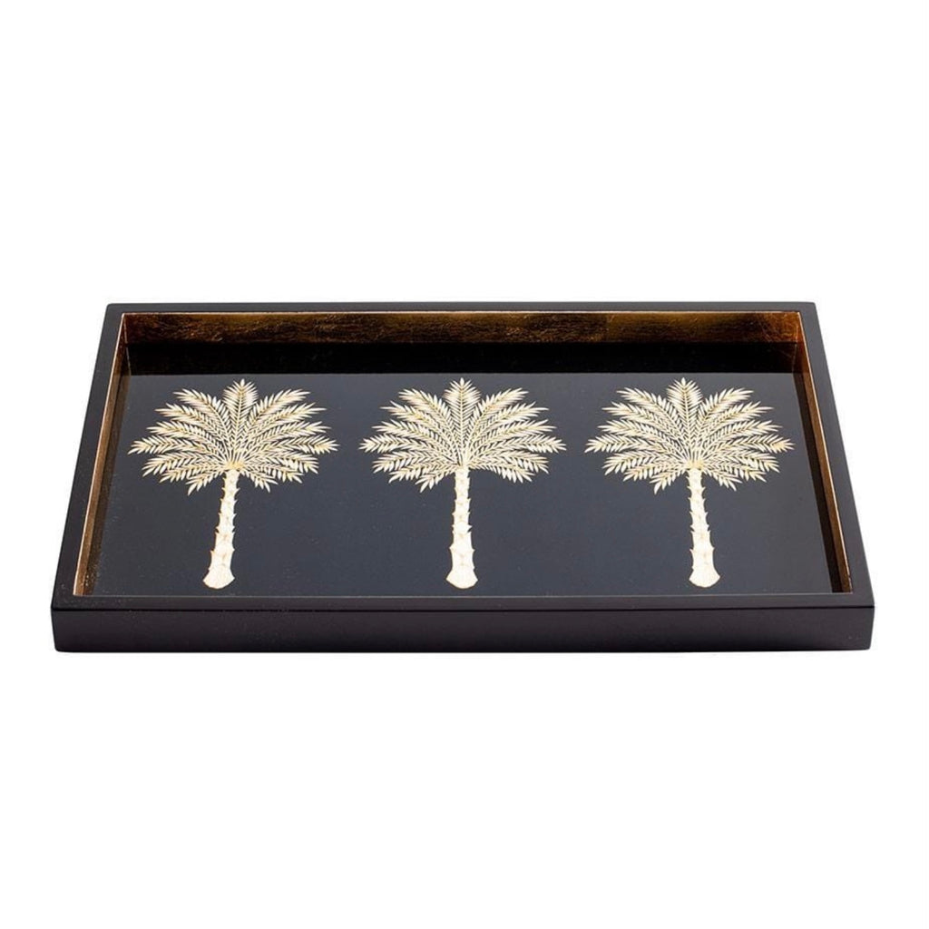 Our stunning Grand Palms Lacquer Tray features three elegant gold Palms on a rich black background.