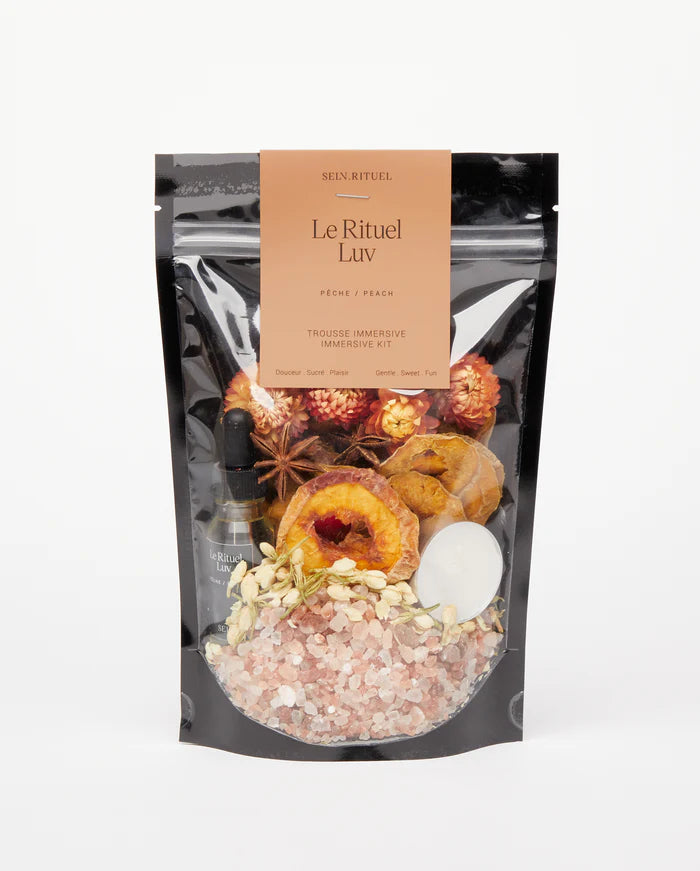 Himalayan pink salt, peaches, jasmine flowers, straw flowers, SELV matches, floating lantern, star anise, Rituel Luv bath and body oil (hsweet almond oil, argan oil, avocado oil, apricot oil, natural peach fragrance and vitamins E).