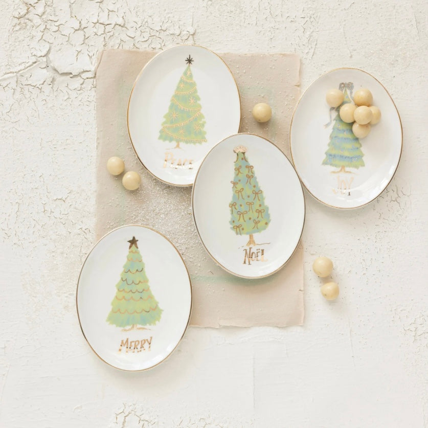 Oval Stoneware Dish w/ Christmas Tree, Word & Gold Electroplating.