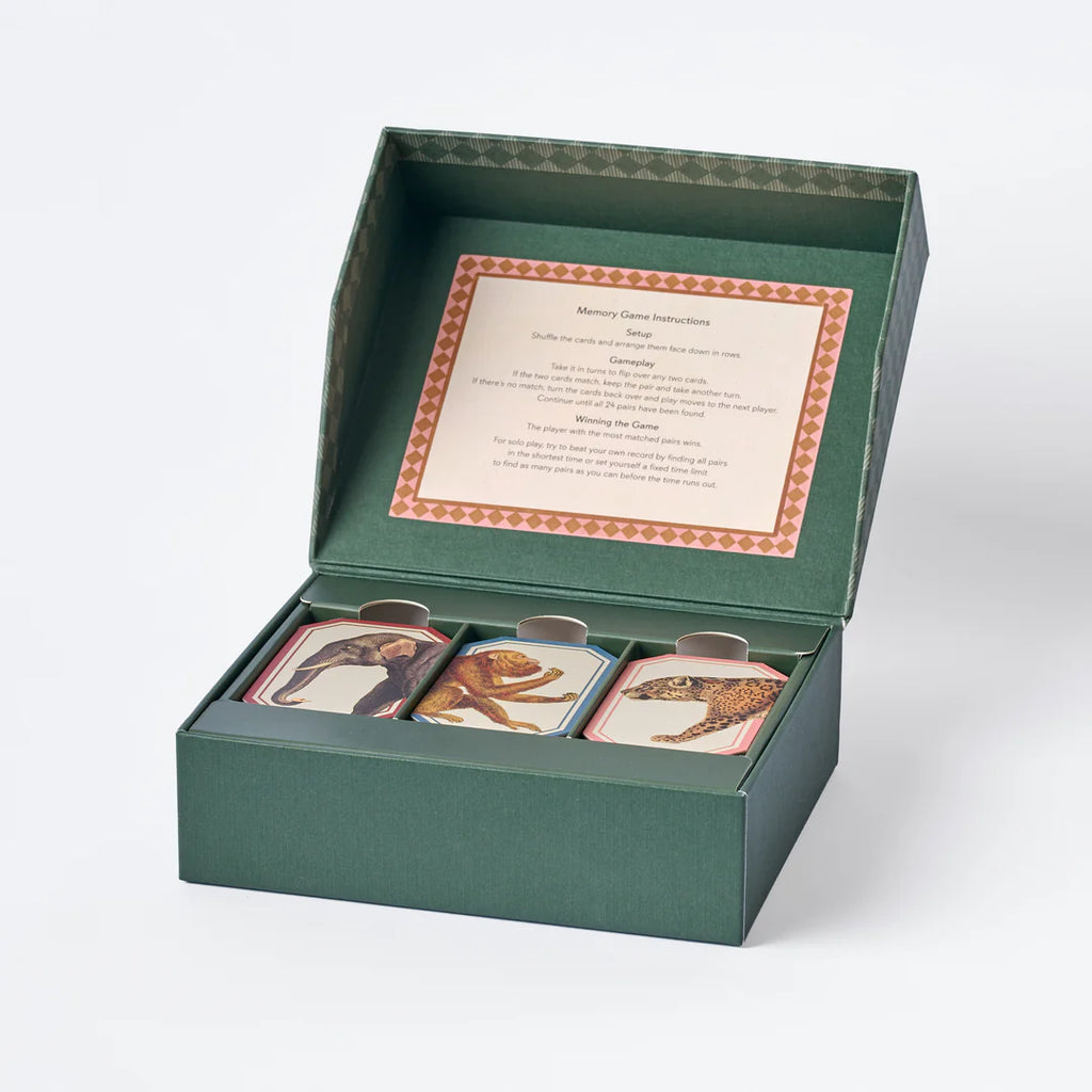 This Animal Kingdom Memory Game includes 24 pairs of shaped cards featuring incredible vintage illustrations of animals of the natural world compiled from antique books. Roomytown's design team in Bath, UK, have carefully adapted and enhanced the original artwork and applied it to each of the playing cards to create this elegant matching game that tests your memory skills.