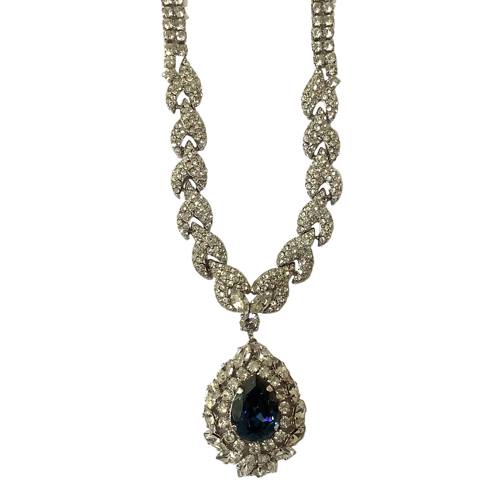 Indulge in elegance with our Vintage Rhinestone & Blue Stone Necklace. The exquisite blue glass teardrop pendant, encircled by sparkling clear rhinestones, exudes sophistication. Elevate any outfit with this luxurious piece, perfect for any occasion.