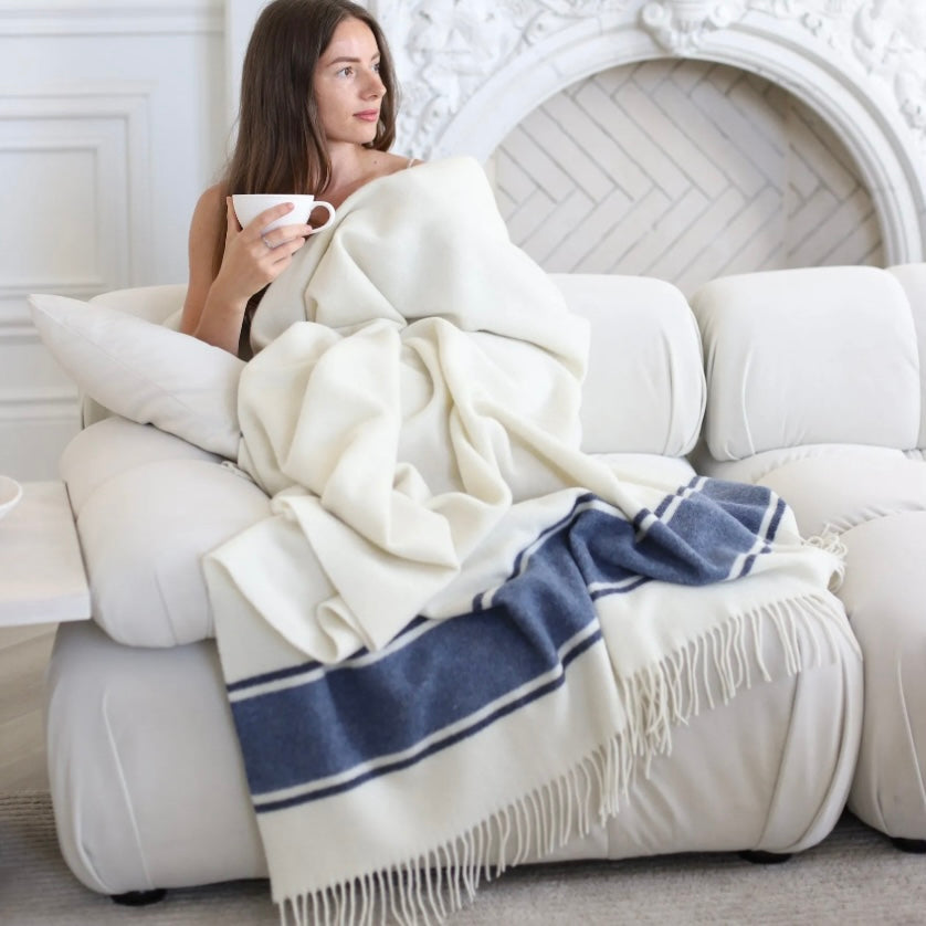 Oslo White w/ Blue & Dark Blue Stripes Cashmere/Wool Throw